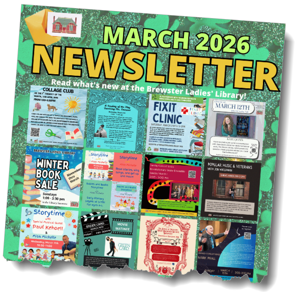 Explore this website to learn about the scholarships we offer to Brewster students, our very popular annual book sale, priority ticketing for the Nickerson Lecture, and the speakers we host as part of our Discovery & Enrichment Series. Click on the graphic to the right to see a recent Library Newsletter and peruse the many offerings for patrons of all ages and interests.
